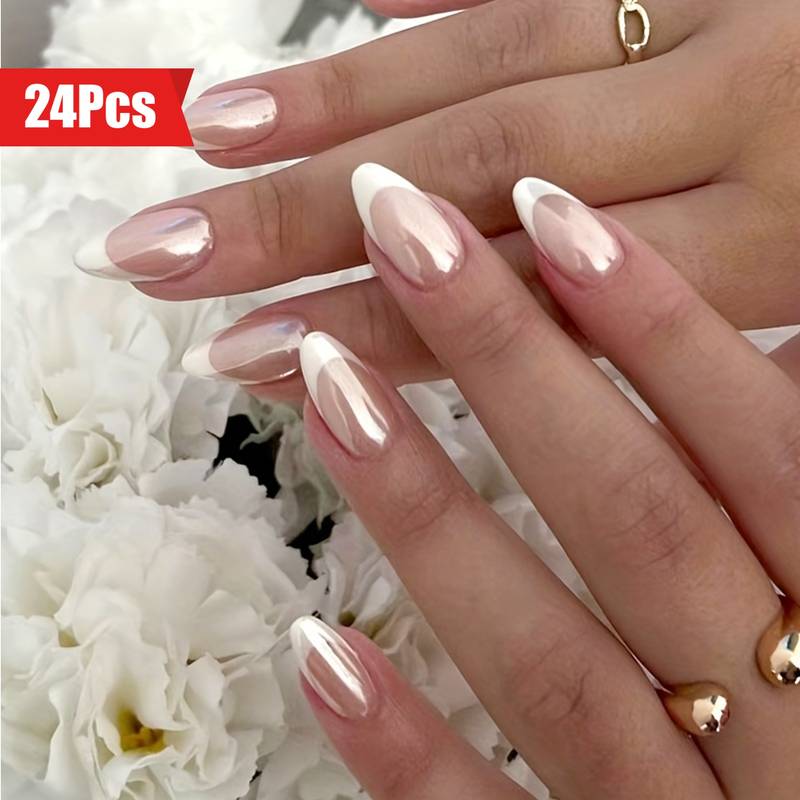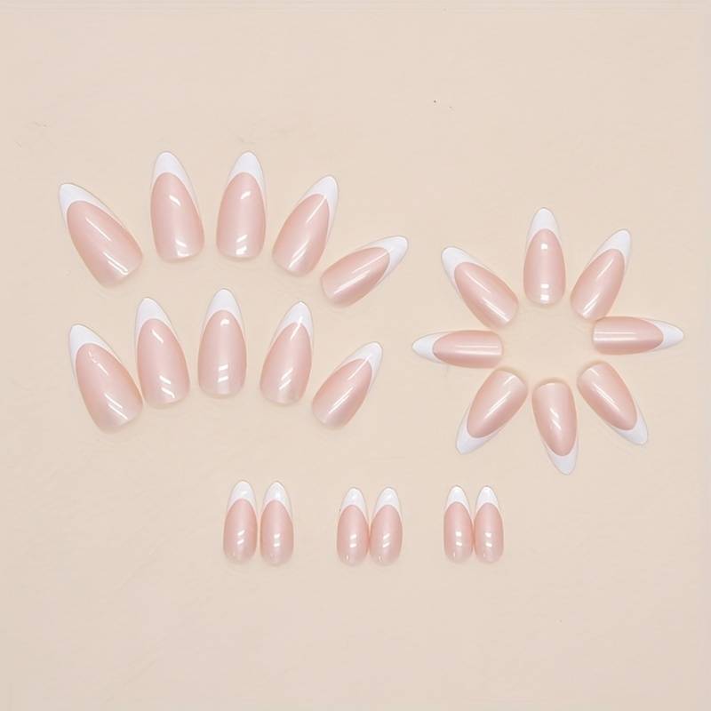 24pcs Glossy Medium Almond Fake Nails, Aurora Pink Press On Nails With White French Tip