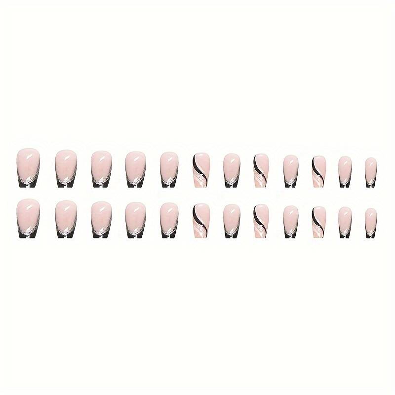 24pcs Glossy Medium Ballerina Fake Nails, Black French Tip Press On Nails With Silvery Glitter Line Design, Sweet Cool False Nails