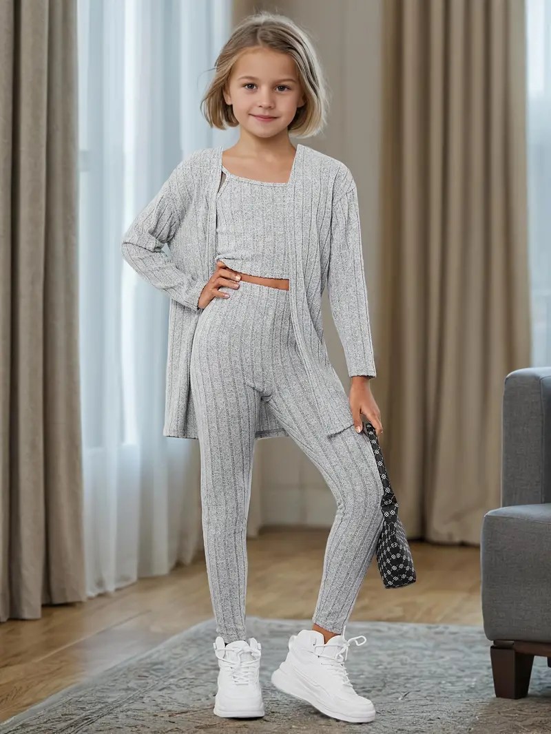 3PCS, Girl’s Solid Rib-knit Long-Sleeve Cardigan + Cami Top + Leggings Pants – Ideal For Casual Outings, Spring & Fall Clothes,